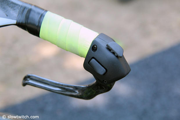 Button controls for the Campagnolo EPS system on the brake levers.