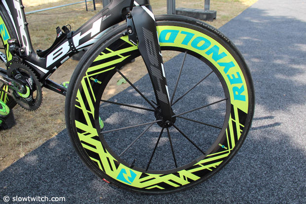 This Reynols wheel paint scheme may be one of the craziest we have encountered. The tires are Schwalbe Ironman tubulars.