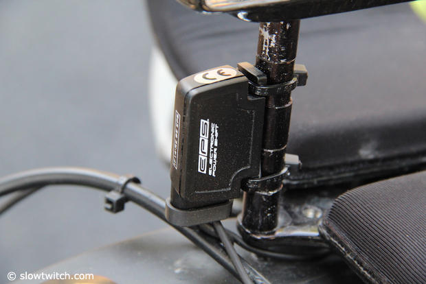 The Campagnolo EPS Power Shift module hides behind one of the cage lift bars.