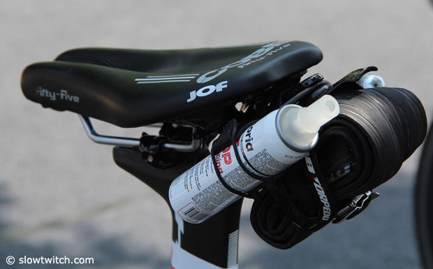 A Cobb JOF fifty-five saddle with an XLab Torpedo cage mounted below and a Pitstop and cartridges on the side, and also a spare Schwalbe tubular that is held together with a toe strap.