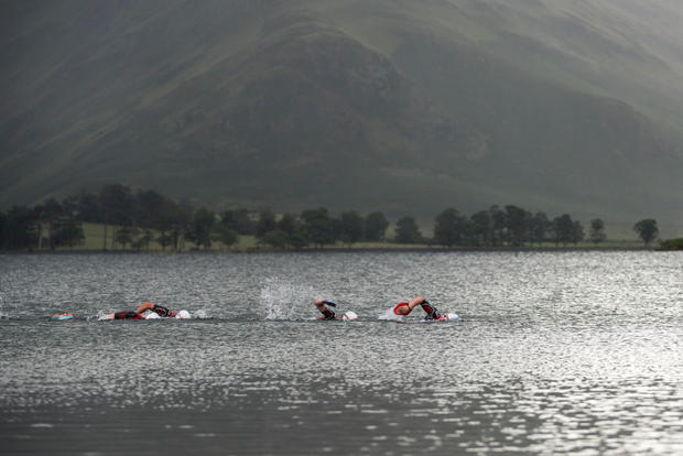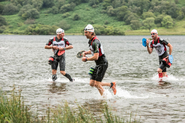 Knut Baadshaug, Hamish Cropper and Markus Rössel (from left) exit Crummock Water after 600 meters of swimming.