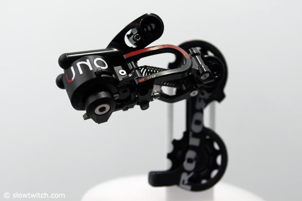 The new ROTOR UNO lever shifts up with a long push and down with a short one. How many gears it shifts up can be set via a bolt on the back of rear derailleur – from 1 to 4 cogs.