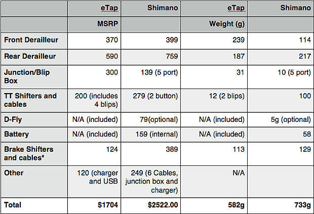 Note: Prices and weights based on specifications provided by companies where available. Di2 pricing can be found cheaper than MSRP.