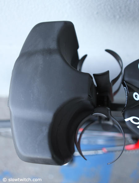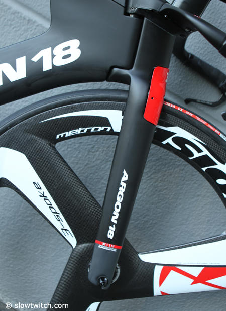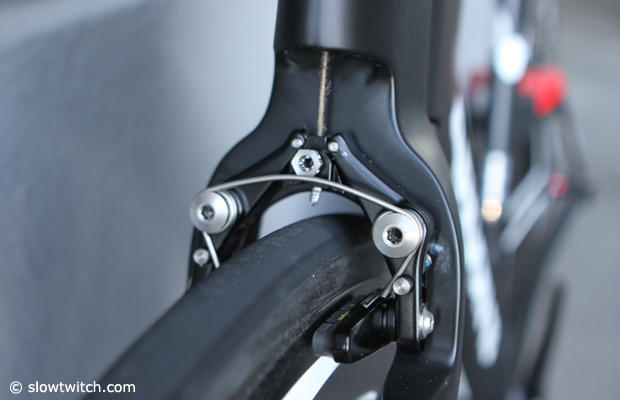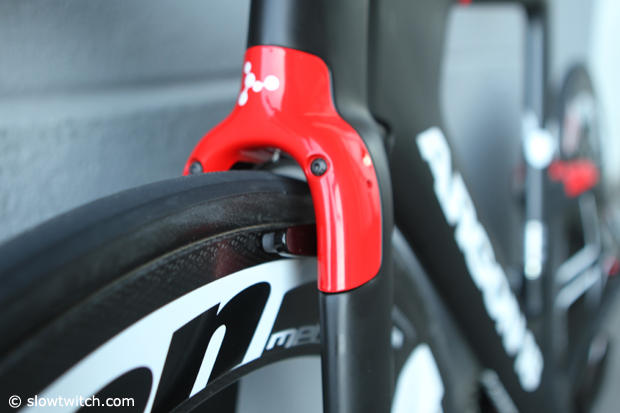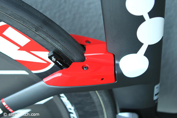 The Argon 18-developed front brake also is hidden under a cover. Adjustments can be made through the small hole on each side.
