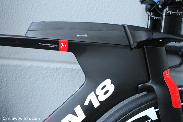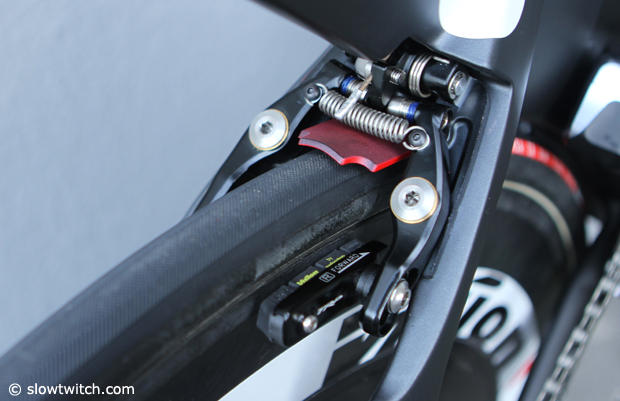 The newly developed Argon 18 brakes are hidden under this cover and sit above the seatstays.