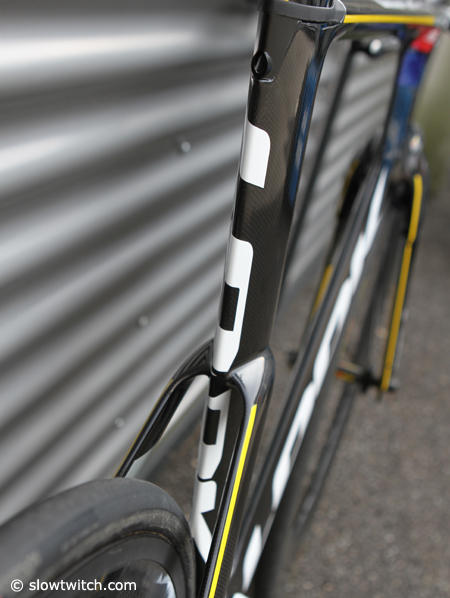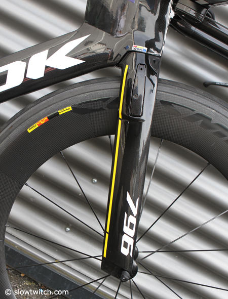 At the 2015 Eurobike show we noticed this lean and mean Look 796 Monoblade, but some of their athletes are already competing on this bike. The bike will be offered in 5 sizes (XS – XL) and the seat angle can be set up ranging from 74 to 80 degrees, but we do not have the complete geometry numbers in our hands yet. Frame weight is listed as 1,100 grams for a size M and the point of entry is rumored to be Euro 9000.