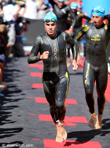 Andi Böcherer and Javier Gomez were first out of the water in the men's race.