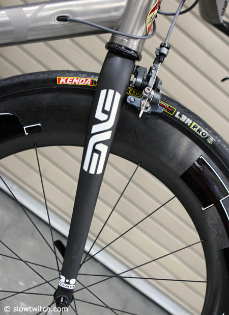 The bike was set up with 25mm Kenda tires, and then adjusted close enough but not too close.
