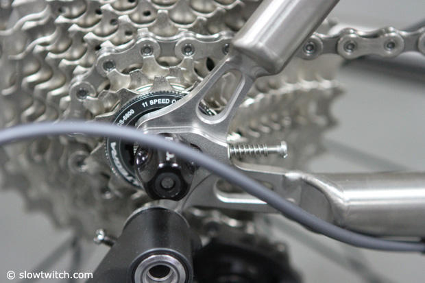 Very nice attention to detail on this adjustable rear-entry dropout. With bigger tires becoming more popular, Lynskey Performance wanted to allow the user to keep the tire close to the seat tube.