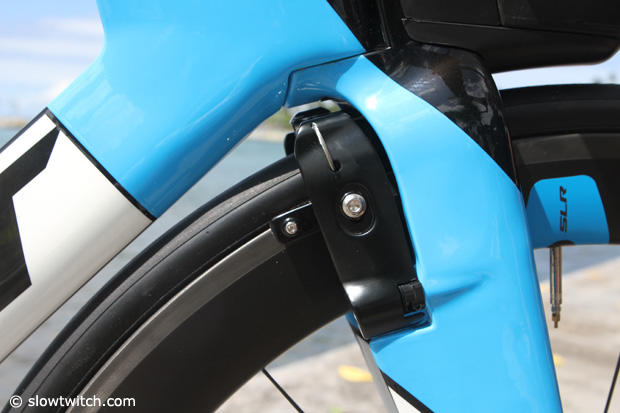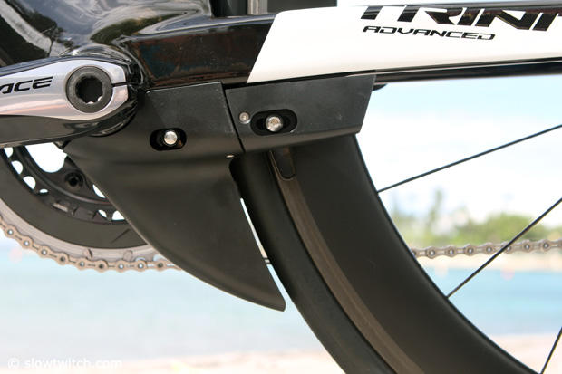 The rear brake is shielded by a fin underneath the bottom bracket.