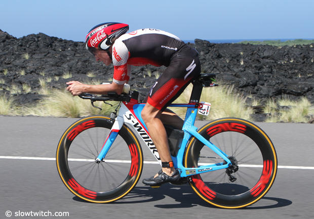 After a strong swim American Andy Potts was near the front most of the day. His bike split in Kona was 4:32:41.