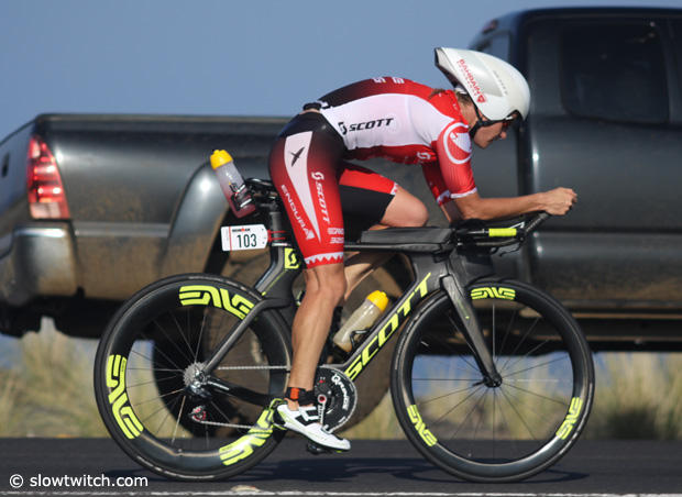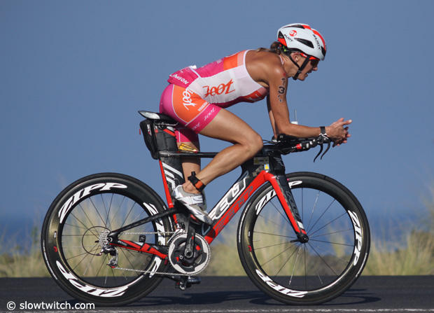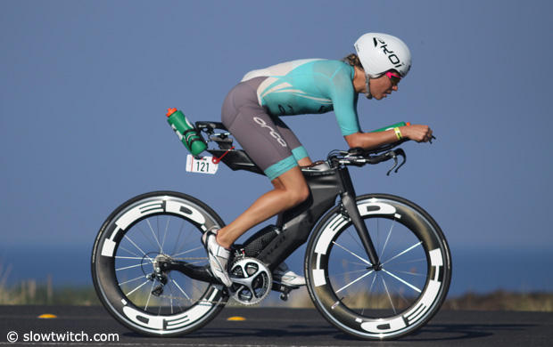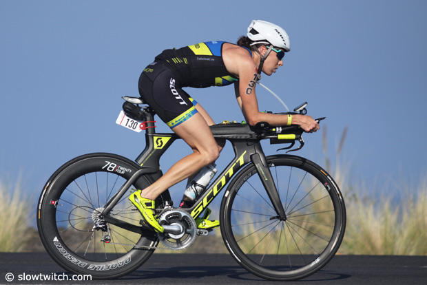 American Kelly Willamson started her day with a 59:54 swim and then rode 5:35:52.