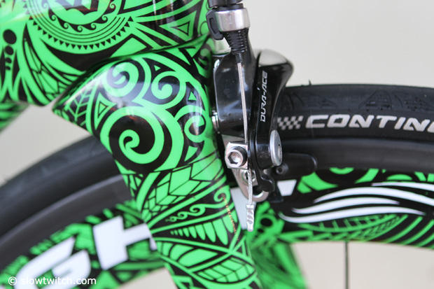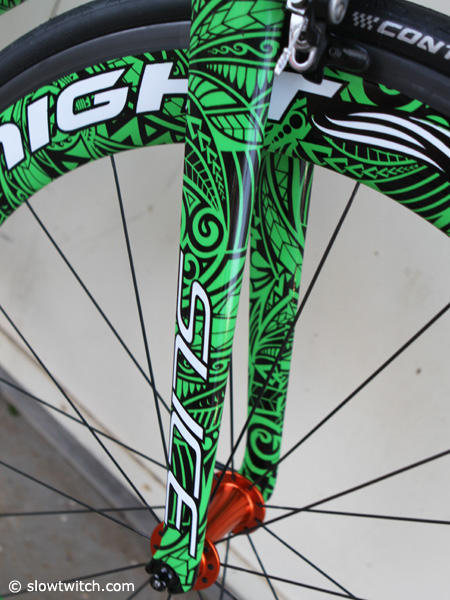 The Knight Composites carbon wheels (65 front and 95 rear) also got custom treatment and Jackson rides 23mm Continental Grand Prix 4000S tires.