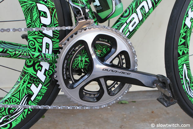 Her Shimano Dura-Ace crank arms are 170mm long and she rides 55-42 rings.