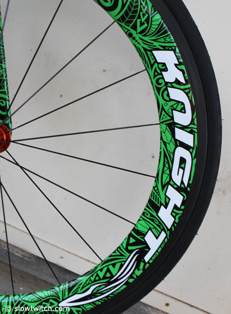 The orange Chris King hubs pop on this green and black theme and have ceramic bearings.