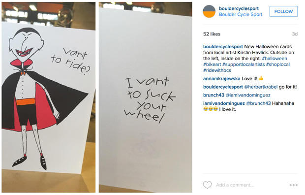 When you send out a holiday card to your customers it should be distinctive and interesting, especially on Halloween. Boulder Cycle Sport recently posted this card on their Instagram account and it is very clever indeed. Now go out and ride, and be sure that no one sucks on your wheels!