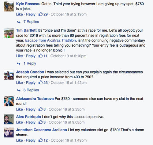 For many folks the initial joy of securing a spot for the 2016 Escape from Alcratraz event was gone in a hurry when they learned that the cost of entry is now a staggering $750. In 2015 the same race was $400 and many do not understand why the race is now almost double the price. The massive $350 price hike has angered many triathletes who were "lucky" to get in, but the lack of response from the event organizers is even more frustrating. The Facebook comments below are a small sampling of the mood and we will follow up with a bigger story.