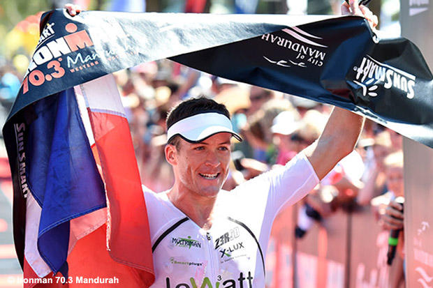 Denis Chevrot of France passed young Australian Jake Montgomery with 5 kilometers to go and Caroline Steffen of Switzerland dominated the women's field to take the pro titles at Ironman 70.3 Mandurah.