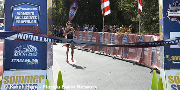 The field of 80 women competed in a draft-legal 750 meter swim, 20 kilometer bike and 5 kilometer run event that followed the format which has been proposed for use at the collegiate level when triathlon is granted official NCAA sport status.