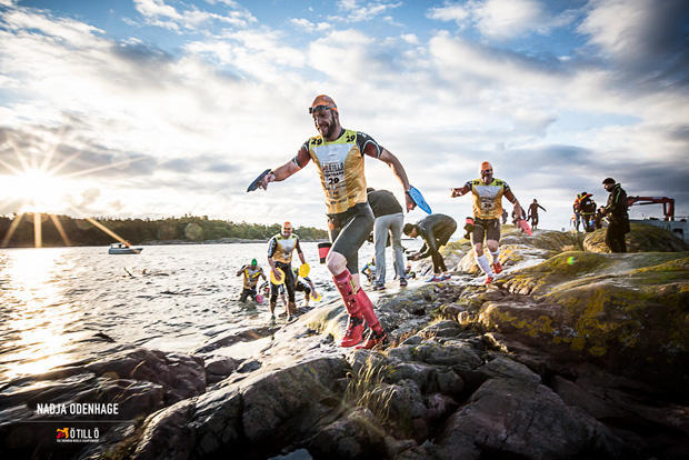 Pro free skier Sverre Liliequist takes a stylish dive during the Koster SwimRun in Sweden. Photo by Nadja Odenhage.