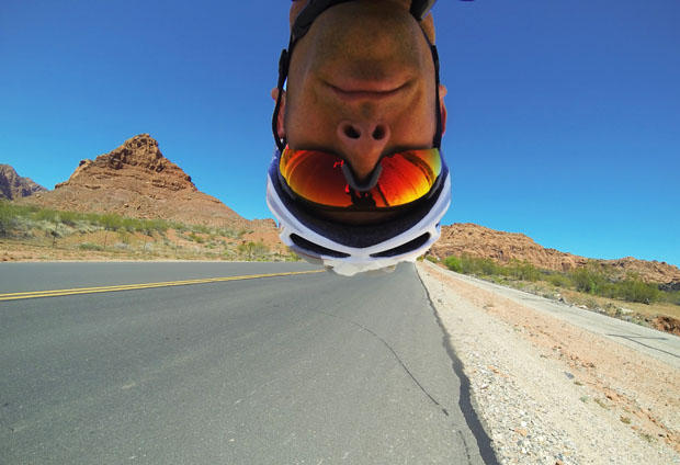 Jordan Rapp takes a surreal Kubrickian selfie while stopped on a training ride in the desert.