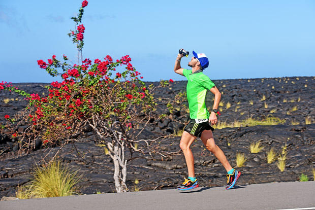 Adam Fox of Australia takes a big gulp of water while running past the lava fields and tropical flowers at Ultraman.