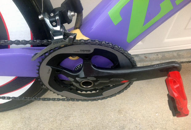 SRAM Red 172.5 cranks and a SRAM Force front derailleur, and the beige spot behind the crank is an original device to protect the frame from chain drop.