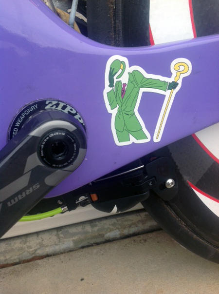 Kevin Grogan of Gear for Multisport in Clermont likes bikes and he recently built up a Zipp 2001 and made this early aero frame fit his personal taste and humor. Grogan got this 1992 model with its original lavender paint in December of 2015, built it up with selected components and has already done a couple smaller events on it. He refers to the bike as The Joker and who are we to disagree with him? It is a size L with a size L beam.