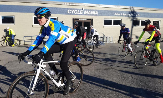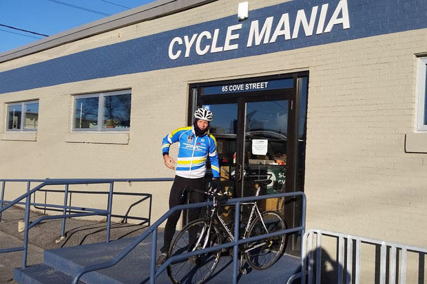 David Brink manages CycleMania and is seen here arriving at the store after his 15-mile commute to open the store in preparation for cyclists to arrive for Maine’s most competitive Saturday group ride.