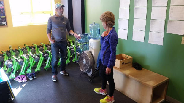 Hoka One One’s tech rep works with a runner who tested out the Vanquish 2 (reviewed on Slowtwitch) demo shoes on the shop run.