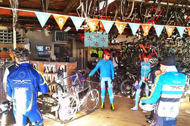 Some riders congregated inside the store to stay warm before the start of the ride.