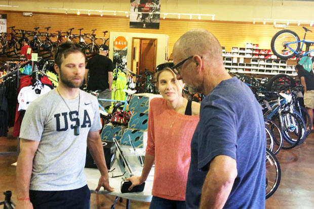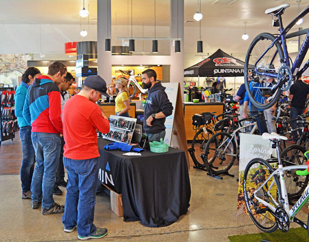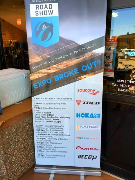Meanwhile, out west on the same day, a Road Show in Tempe, Arizona was ongoing at Landis Cyclery and Sole Sports, bike and run specialty sharing a common wall. There were banners with the show's itinerary and supporting vendors.