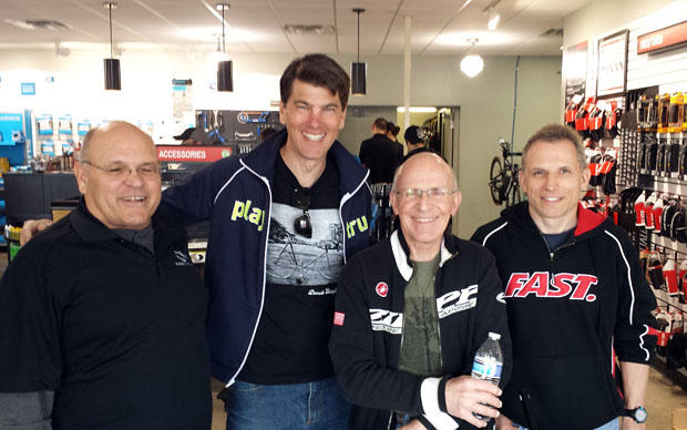 John Cobb at left at the Fraser Bicycle Road Show. Frankie Andreu stopped in to say hi.