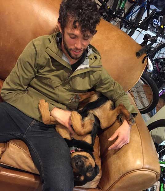 Overlook Mountain Bikes in Woodstock, NY, accessorized in the correct order. They got the saddle-tone couch, then they got their Rottweiler and Australian Shepard mix Lola (popular shop dog name), and most recently they got a new Purely Custom fit bike to go with their new designations as F.I.S.T.-Certified bike fitters.