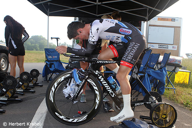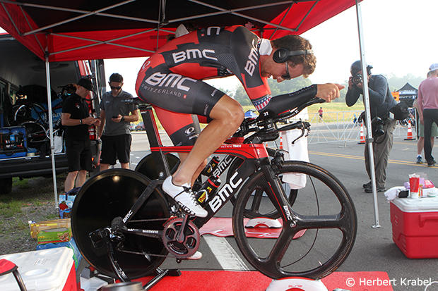 Taylor Phinney was in his own world as he warmed up for the big 48km effort.