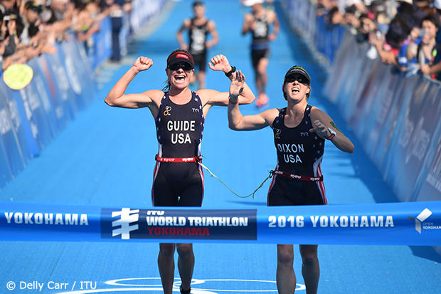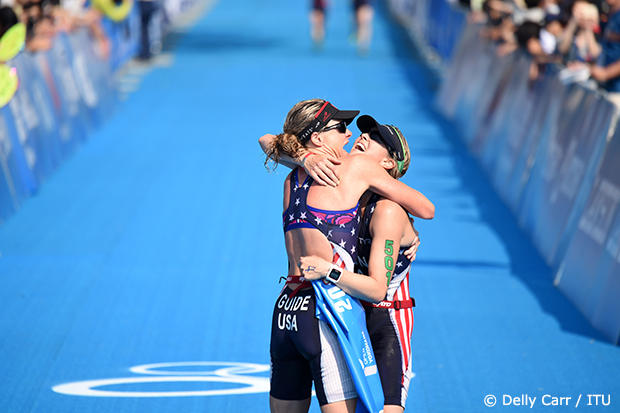 Susanne: We won the gold! You can see from the picture where we are hugging at the finish line. It was an amazing win! Amy had terrible bronchitis for 2 weeks leading into this race. Her goal was to podium ahead of the Japanese paratriathlete. This would limit points she could earn which could have moved her up closer to Amy in the World Ranking. Our other competition was US athlete Liz Baker who beat Amy in March at the Pan American Championships. We had great transitions and I helped us get a 2-minute lead off the bike because it was a very technical course with many turns. We got onto the run and this is where it was memorable and magical for me as the guide. I talked and pushed Amy through the last 1.7 miles which gave her the strength mentally to keep pushing and physically to accomplish holding her 7:10 per mile run pace! As we were making the final turns and running down the blue carpet I was pumping my fists in the air to excite the crowd and scream for Amy. I said, “You are going to win and inspire people around the world.” Get ready to grab that tape and enjoy your victory! She crossed, grabbed the tape and fell to the ground in exhaustion. I picked her up and said, “You did it, you won!” The photo really captured this moment.