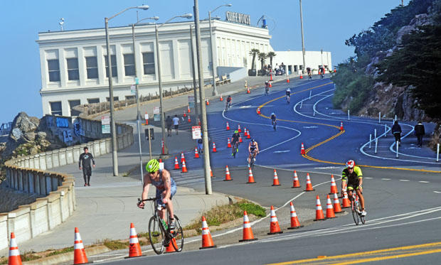 Riders hit high speeds on the winding downhill past the Cliff House restaurant.
