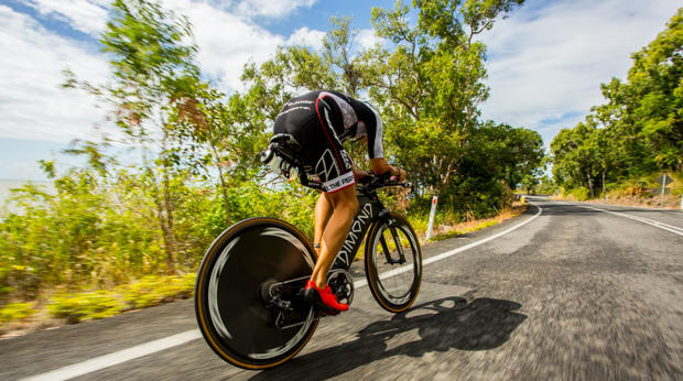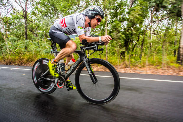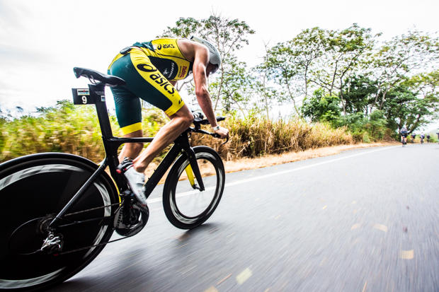 Pete Jacobs proudly sports the green and gold colors of Australia with his custom Louis Garneau kit.