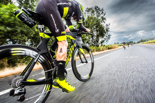 Luke McKenzie chose to put on socks in T1, a rarity in the pro field. His distinctive black and neon yellow kit and bike are easy to spot out there.