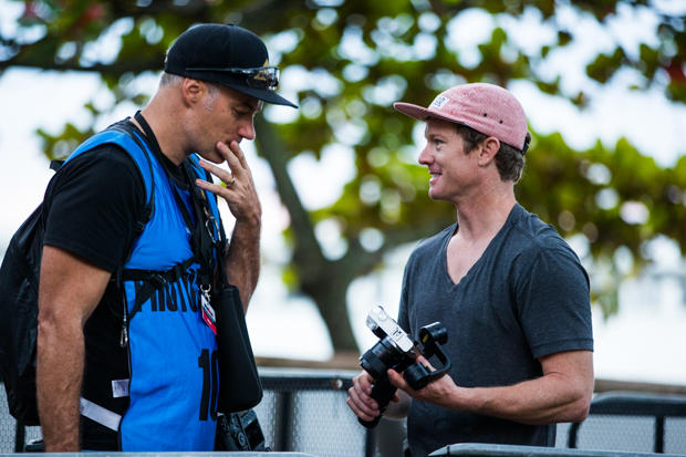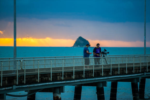 As the Asia-Pacific Championships, Cairns had plenty of media on site. Here, one of two TV crews sets up on the pier in Palm Cove as the sun rises.