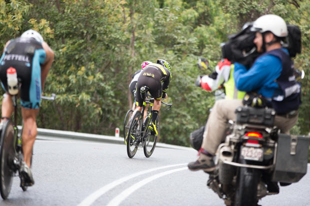 "On your right" when passing is something that takes some getting used to for the internationals, though much of the field on both pro and AG side comes from Australia. Here Luke McKenzie leads Clayton Fetell past an AG athlete on the second loop of the bike.