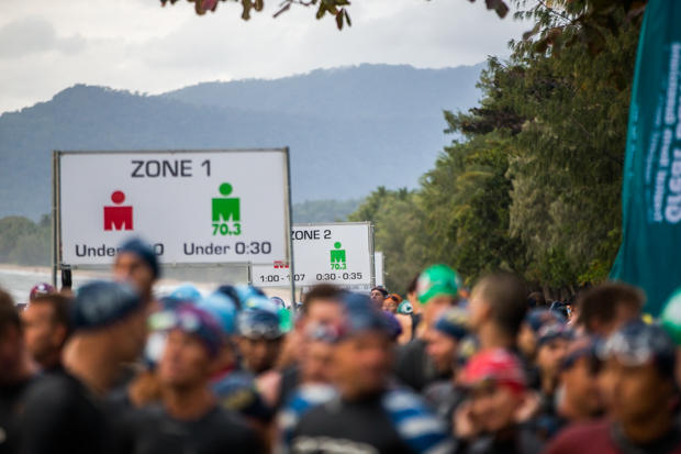 Sign posts give seed times for AG swimmers. The different time splits and colors are because Cairns hosts both a 70.3 and 140.6 race on the same course on the same day. The 70.3 athletes go first.