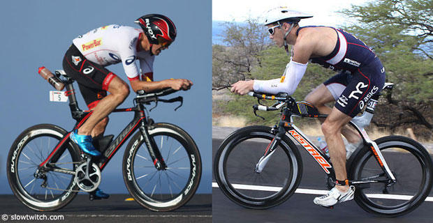 Back to the chart above, Pros and age group racers competing in half and full distance triathlons will sit slightly further forward or back, and slightly lower versus higher. Where along the gradient of back to fore, high to low? Below is Andy Potts. Twice. Which Andy would you rather be? One is from 2012, the other 2015 and I shouldn't have to tell you that the left hand picture is more current, except that he now rides a Cannondale Slice. Andy's position sits dead center in the range in the chart above, but I suspect were we to use the Pad placement of the position on the right it would be different. In this case Andy's data point in the chart above would sit higher up and further back (to the left), that is, in the Mildly Tall range, or even high and back and out of that range entirely. This is the maturation of a position, and because of the work of Mat Steinmetz (who fits Andy) we can see how this position has morphed into the professional position it is today.