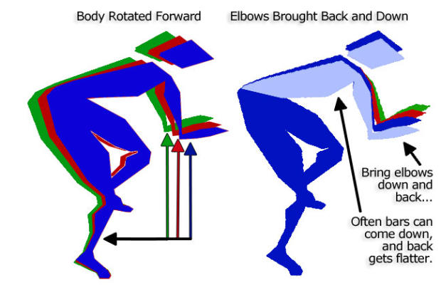 In the right hand side of the drawing above is a rider who is in danger of having a good position, but his pad position is too stretched and too high. His shoulder angle is too obtuse. If he simply drops his pads he won't find comfort. But if he both drops his pads and brings his pads closer in, then he'll find comfort and power, and maybe through an even lower pad position.