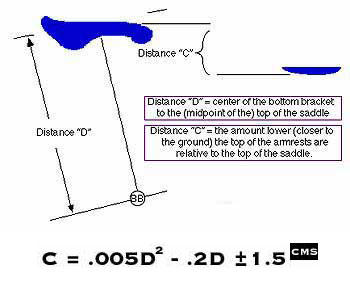 In fact, below is a formula for calculating expected armrest drop among pros and I'll wager this formula holds true for the pros. It's not bulletproof, and about 15 years ago it morphed slightly to normalize for seat angle, but I show it here in all its graphic barbarity because these graphics were made more than 20 years ago, and the formula itself was generated in 1991, 4 years after the first aerobar hit triathlon and 2 years after the first Quintana Roo tri bike hit triathlon. This is simply to show that many pros had the right seat angle, armrest drop, and so forth, figured out by then. You don't need decades. You put in a few 400-mile bike weeks on aero bars and you'll figure out pretty quickly what works and what doesn't.