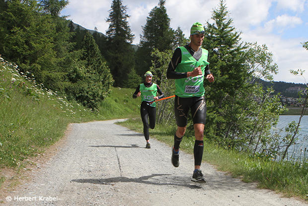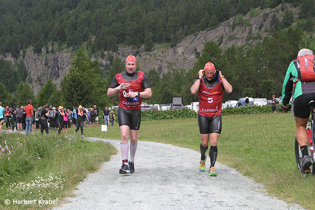 The female team of Charlotta Nilsson and Bibben Nordblom were in a tight battle with the mixed squad of Jean-Claude Besse and Cendrine Gerosa, with the Swedes pulling away during each swim and the Swiss team reeling them back in during the runs.