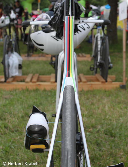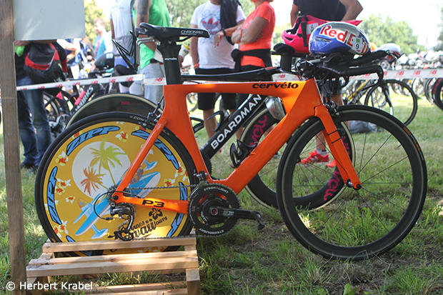 This very cool orange Cervelo P3 of Thomas Hellriegel on the other hand with bib #9 is sitting in the pro racks.