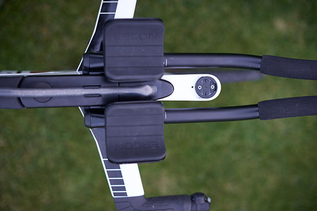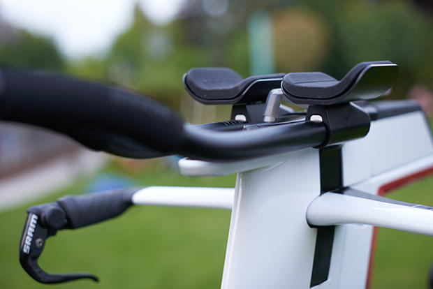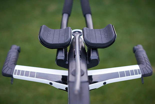 The Ergon arm pads, grips and extension covers are fantastic and feel great. Notice also the SRAM E-tap buttons on the base bars.