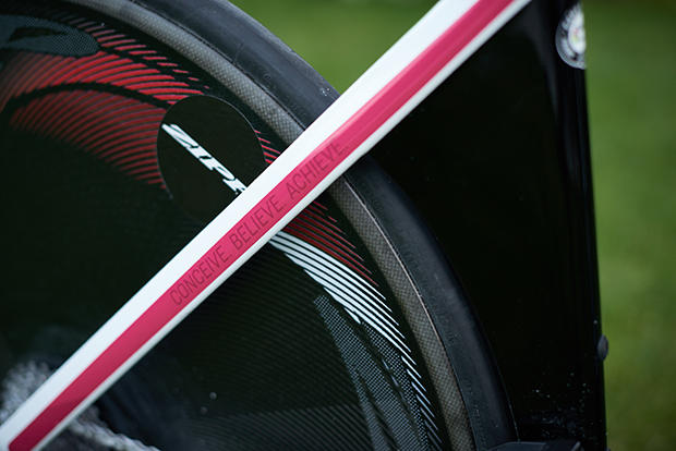 An inspirational message on the seat stay. The Continental tires are also a special custom model with extra low rolling resistance.