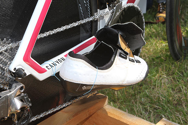 As an experienced ITU athlete and Olympic champion Jan Frodeno knows how to have his Bont shoes set up perfectly for a speedy transition. His shoes sit on Speedplay pedals. Notice also the CeramicSpeed details.